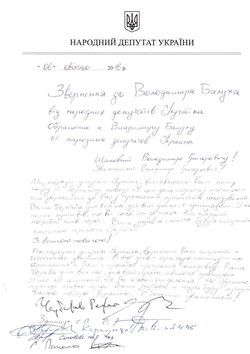6 квітня 2018 року народні депутати України - представники різних фракцій Верховної Ради України - звернулися до Володимира Балуха, українського політичного в’язня в Криму, з проханням зупинити голодування у зв’язку зі стрімким погіршенням його здоров’я та ризику втрати життя.