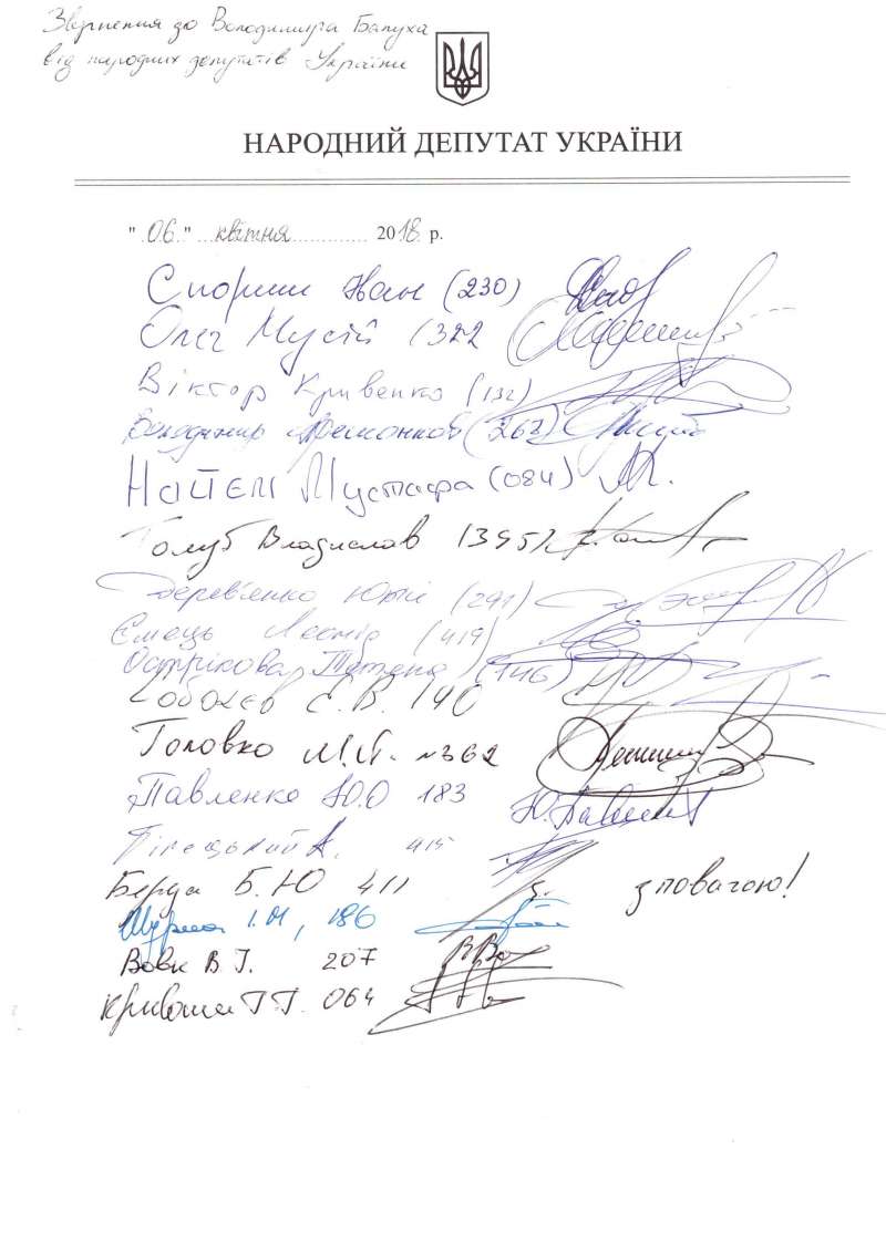 Звернення підписали: Рефат Чубаров, Світлана Заліщук, Мустафа Найєм, Єгор Соболєв, Владислав Голуб, Сергій Лещенко, Валерій Карпунцов, Юрій Соловей, Іван Спориш, Олег Мусій, Віктор Кривенко, Володимир Арешонков, Юрій Дерев’янко, Леонід Ємець, Тетяна Острікова, Михайло Головко, Юрій Павленко, Андрій Білецький, Борислав Береза, Ігор Шурма, Віктор Вовк, Геннадій Кривошея.