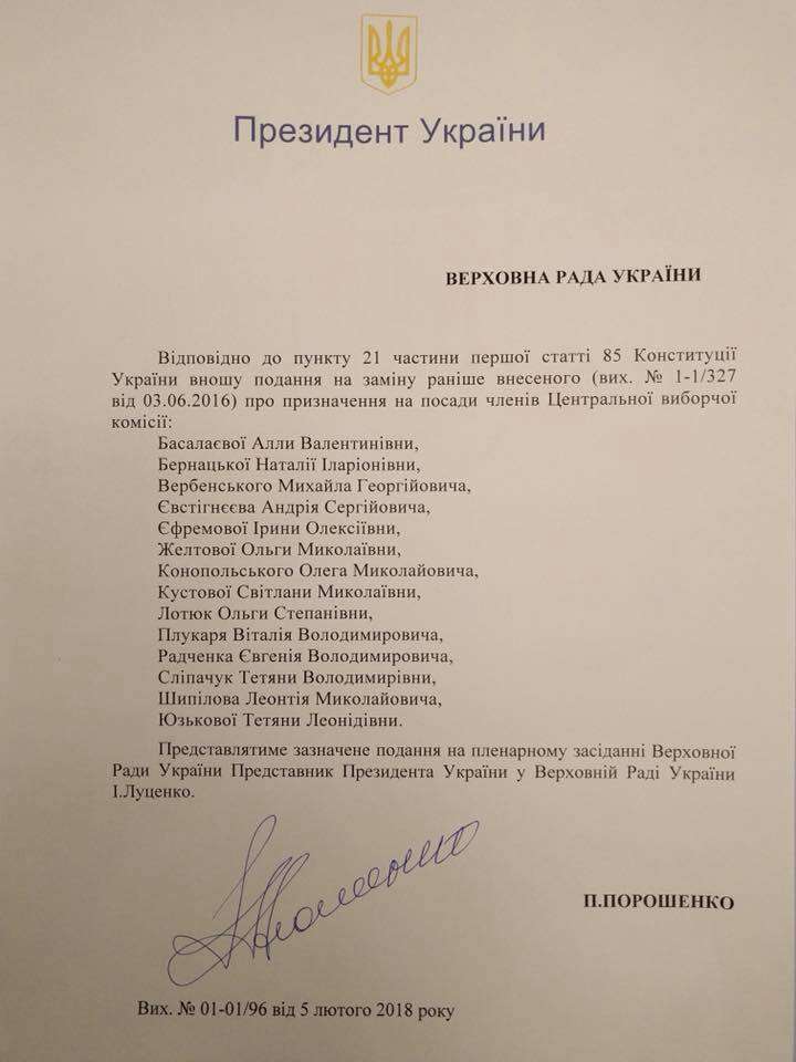 Голова Верховної Ради України Андрій Парубій на своїй сторінці у фейсбук повідомив, що щойно Президент України Петро Порошенко вніс подання на членів Центральної виборчої комісії до Парламенту.