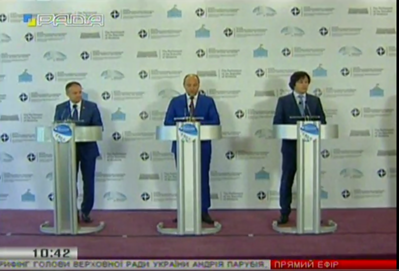 A joint three-speaker briefing of Andriy Parubiy, the Chairperson of the Verkhovna Rada of Ukraine (Ukrainian Parliament), Irakli Kobakhidze, the Chairman of the Parliament of Georgia, and Andrian Candu, the Chairman of the Moldovan Parliament took place at the Parliament’s edifice.