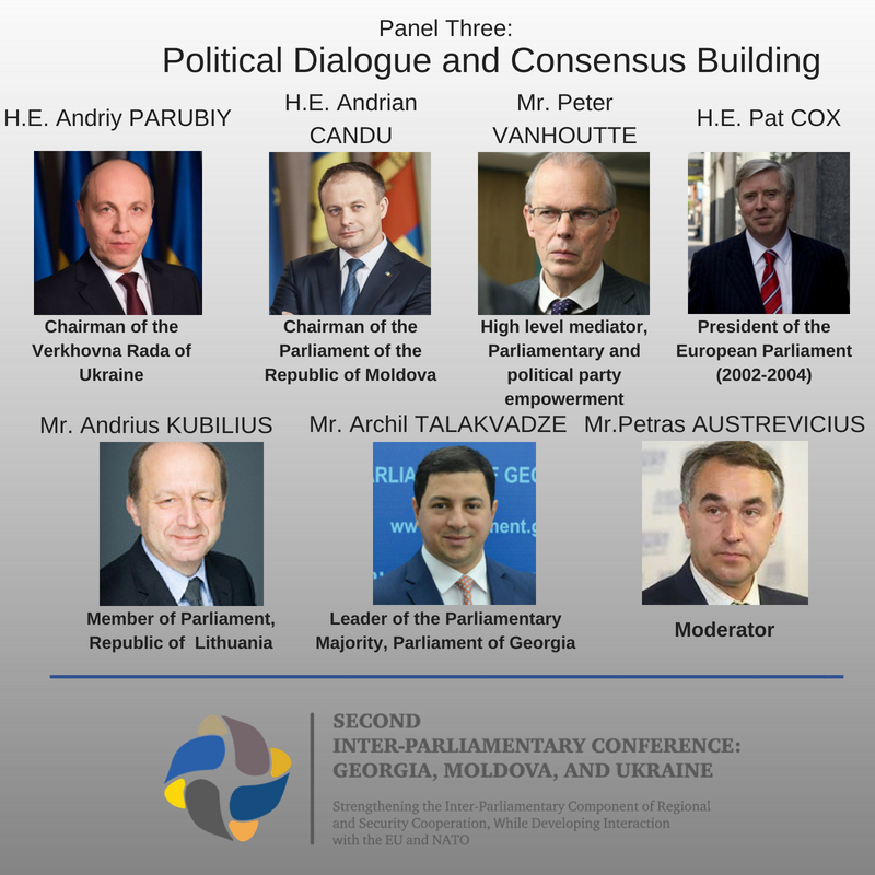 Afterwards, Archil Talakvadze, MP, the Majority Leader, the Parliament of Georgia, Pat Cox, former President of the European Parliament (2002-2004), Andrius Kubilius, a Lithuanian politician, member of the Lithuanian Seimas, Peter Vanhoutte, High Level Mediator, parliamentary and political parties empowerment expert, delivered their reports during the ongoing panel.