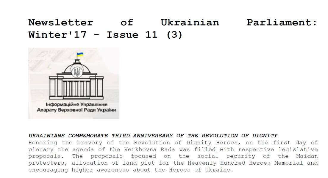 Honoring the bravery of the Revolution of Dignity Heroes, on the first day of plenary the agenda of the Verkhovna Rada was filled with respective legislative proposals. The proposals focused on the social security of the Maidan protesters, allocation of land plot for the Heavenly Hundred Heroes Memorial and encouraging higher awareness about the Heroes of Ukraine.