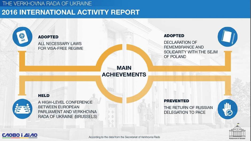 International activities of the Verkhovna Rada of Ukraine of the 8th convocation during the 5th plenary session were centered on efforts to de-occupy Crimea and Donbas (see infographic). The results of international activities of the Parliament during the 5th session were substantial. Firstly, the Verkhovna Rada of Ukraine adopted all necessary laws to introduce visa free regime for Ukrainians. Secondly, representatives of the Ukrainian Parliament organised a high-level conference between the European Parliament and the Verkovna Rada (in Brussels, Belgium). Thirdly, a common resolution on remembrance and solidarity was concluded with the Sejm of the Republic of Poland. The work of inter-parliamentary assemblies resulted in prevention of the return of the Russian delegation to PACE.