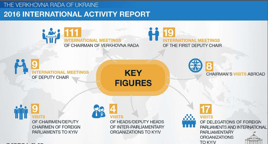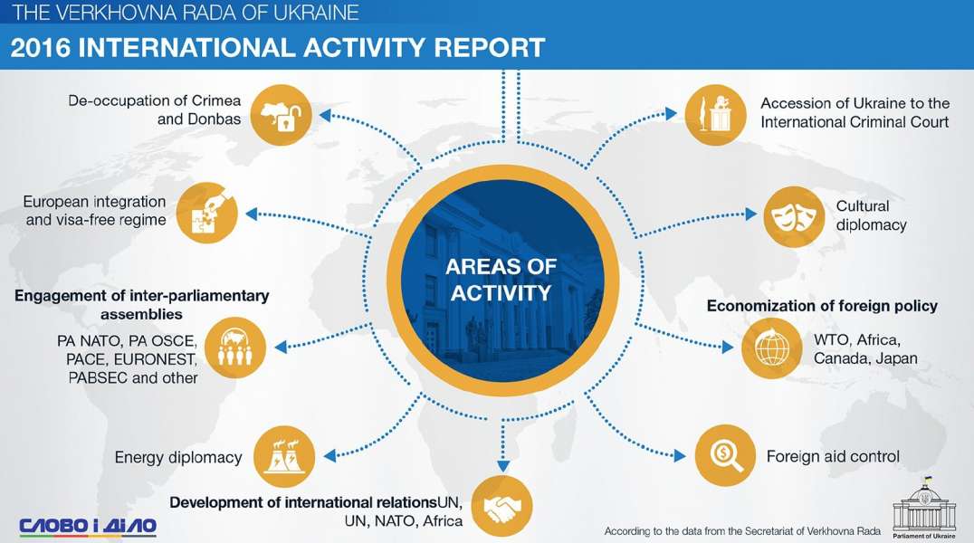International activities of the Ukrainian parliament were mostly focused on de-occupation of Crimea and parts of Donbas region. Special attention was paid to Ukraine’s work at inter-parliamentary assemblies: NATO PA, OSCE PA, PACE, EURONEST and BSEC. Significant contribution was made in fostering international cooperation within NATO and the UN. Moreover, the scope of activities focused on development of energy and cultural diplomacy and attraction of foreign direct investments.