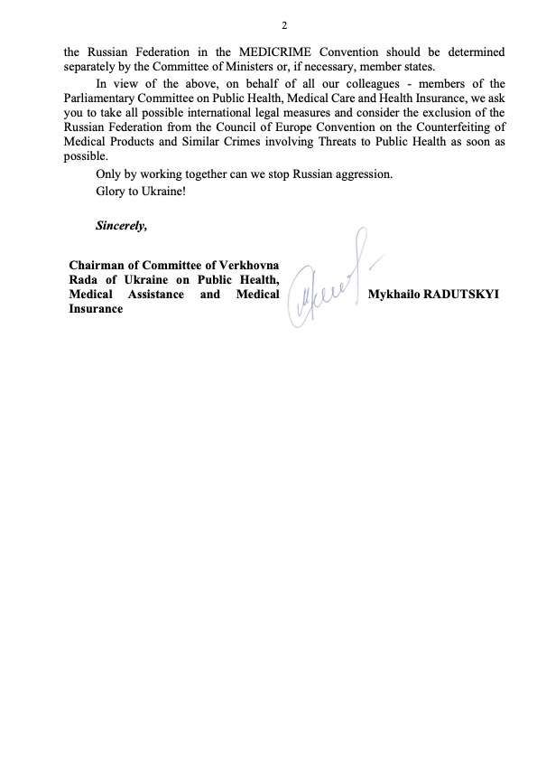 Mykhaylo Radutsky, The Chairman of the Nation's Health Committee, wrote an appeal to the members of the Council of Europe demanding the exclusion of Russia from the MEDICRIME Convention (International Treaty on the Establishment of Criminal Liability for Counterfeiting Medical Products), ratified by the russian federation on March 20, 2018.