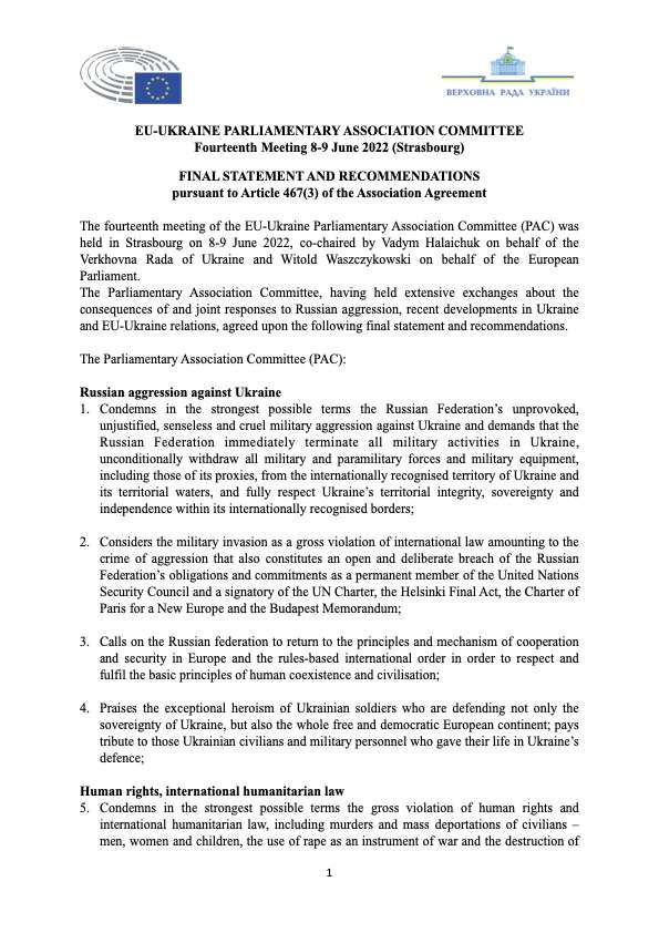 Members of the Parliamentary Committee of the EU-Ukraine Association adopted a joint statement based on the results of the 14th meeting, which took place in Strasbourg on June 8-9, 2022.