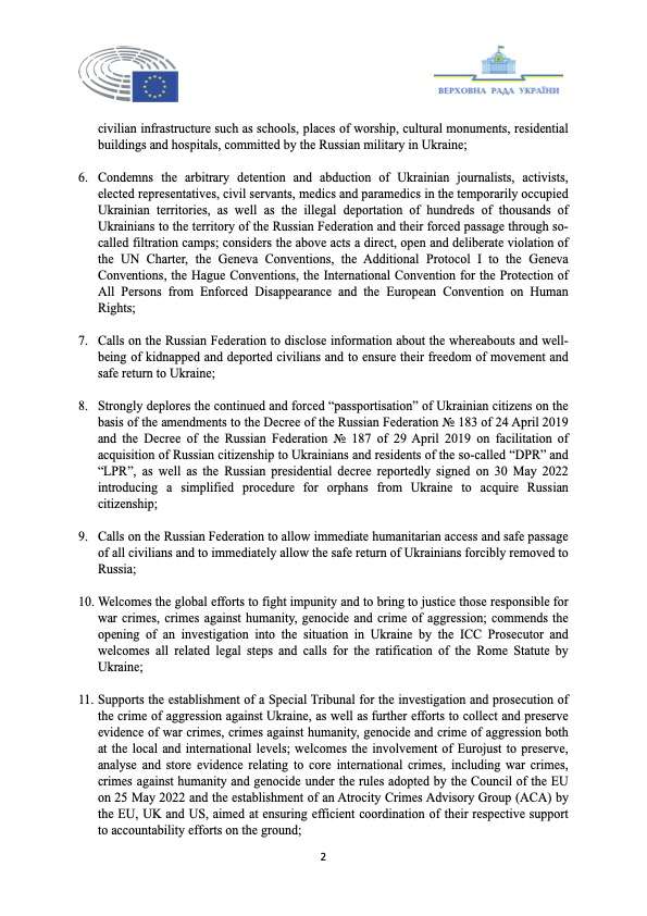 - Strongly condemn the unprovoked, unjustified, senseless, and brutal military aggression of the russian federation against Ukraine and demand that russia immediately withdraw all military and paramilitary forces and military equipment from the internationally recognized territory of Ukraine and its territorial waters;