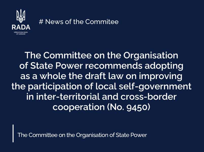The Committee on the Implementation of Ukraine's International Legal Obligations in the Field of European Integration and EU Law recommends that the Parliament adopt in the second reading and as a whole the draft law on amendments to certain laws of Ukraine on improving the participation of local self-government in inter-territorial and cross-border cooperation (Reg. No. 9450).
