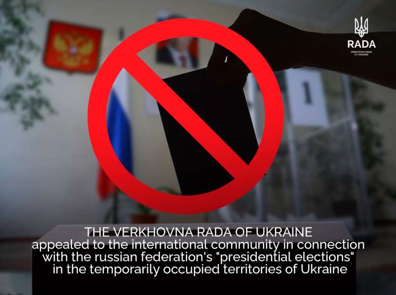 The Verkhovna Rada of Ukraine has adopted the Resolution “On the Appeal of the Verkhovna Rada of Ukraine to the Governments and Parliaments of Foreign States, International Organisations, Parliamentary Assemblies in connection with the holding of the “presidential elections” by the russian federation in the temporarily occupied territory of Ukraine" (p.№11078).