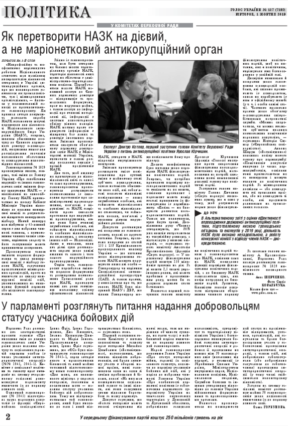 Комітет Верховної Ради України з питань антикорупційної політики розглянув підготовлений до другого читання проект закону про внесення змін до деяких законодавчих актів України щодо забезпечення ефективності інституційного механізму запобігання корупції (реєстр. No 1029), внесений Президентом України як невідкладний. Законопроект регулює діяльність Національного агентства з питань запобігання корупції (НАЗК), до роботи якого є безліч запитань та невдоволення. (читайте у «Голосі України» на 1-2 стор. >>> article/322246)