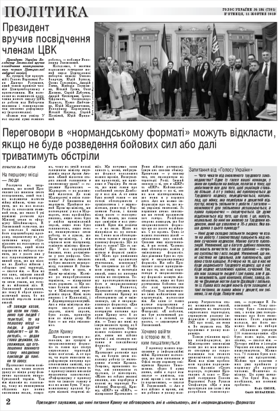 Учора Президент Володимир Зеленський весь день працював у форматі прес- марафону. Перший десяток журналістів потрапив на розмову до глави держави о десятій годині ранку. Спілкування з представниками ЗМІ тривало аж до самого вечора. Говорили невимушено і розкуто. Питання ставили не завжди зручні, але й очільник країни у своїх відповідях не дотримувався суворої офіційності. Найбільше вітчизняні та іноземні журналісти цікавилися питаннями запровадження "формули Штайнмаєра" та перспективою наших майбутніх стосунків зі Сполученими Штатами Америки. Ішлося, звісно, й про події на сході. (читайте у «Голосі України» на 1-2 стор. >>> article/322696)