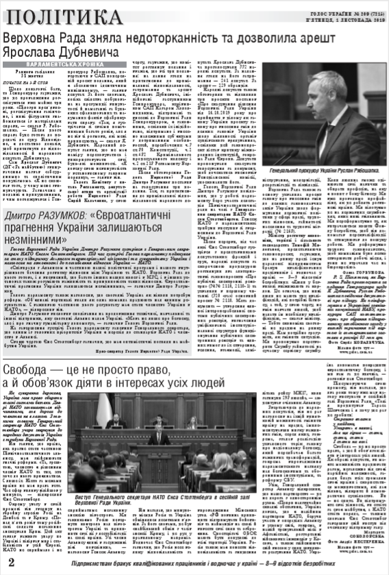 Першим питанням порядку денного Верховна Рада розглянула надання згоди на притягнення до кримінальної відповідальності, затримання та арешт народного депутата України Ярослава Дубневича. З парламентської трибуни виступив Генеральний прокурор Руслан Рябошапка, який зауважив, що підтримав клопотання НАБУ та керівника САП щодо внесення трьох подань до парламенту: щодо зняття депутатської недоторканності, затримання та взяття під варту народного депутата Ярослава Дубневича. (читайте у «Голосі України» на 1-2 стор. >>> article/323483)