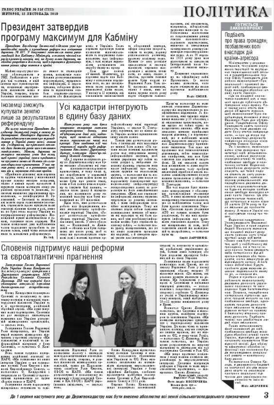 "До 1 серпня наступного року до Держгеокадастру має бути внесено абсолютно всі землі сільськогосподарського призначення, в тому числі ті, що перебувають у державній власності, адже навіть мови не може бути про ринок землі, поки в базі даних немає порядку та існують білі плями", - сказав глава уряду й підкреслив, що наступного року земельний кадастр має бути наповнений на 100 відсотків. (читайте у «Голосі України» на 3 стор. >>> article/323909)