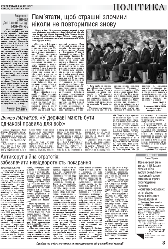 Учора, в день 79-х роковин масових розстрілів мирного населення нацистами в Києві Президент Володимир Зеленський, Голова Верховної Ради Дмитро Разумков та Прем'єр-міністр Денис Шмигаль узяли участь у церемонії вшанування пам'яті жертв трагедії Бабиного Яру.