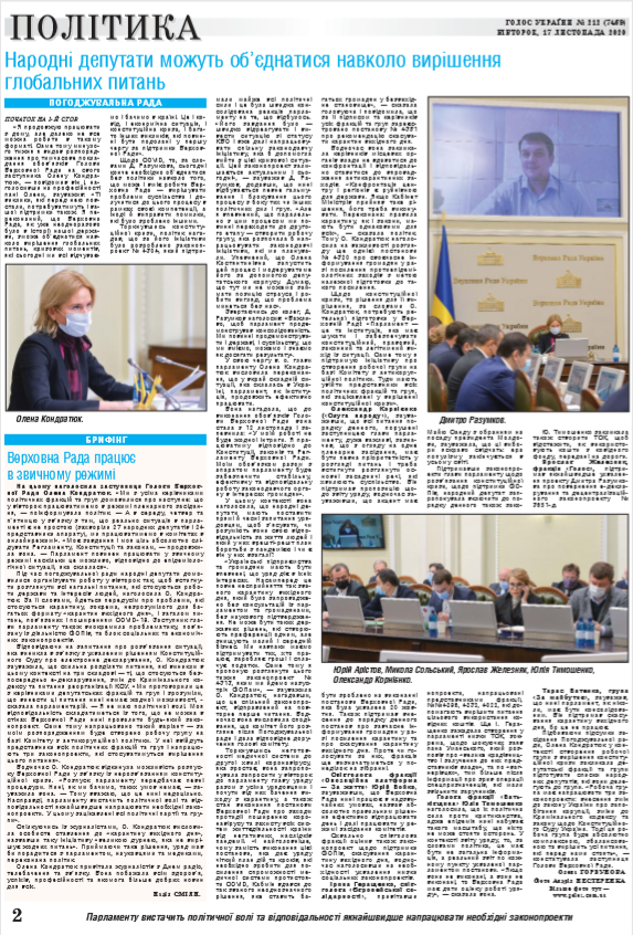 Учорашнє засідання Погоджувальної ради через хворобу на коронавірус Голови Верховної Ради Дмитра Разумкова та його Першого заступника Руслана Стефанчука відбувалось під головуванням заступниці Голови Верховної Ради Олени Кондратюк. Дмитро Разумков звернувся до учасників засідання через відеозв'язок. Він подякував усім за підтримку в тяжку хвилину хвороби. (читайте у «Голосі України» на 1-2 стор. >>> article/338430).