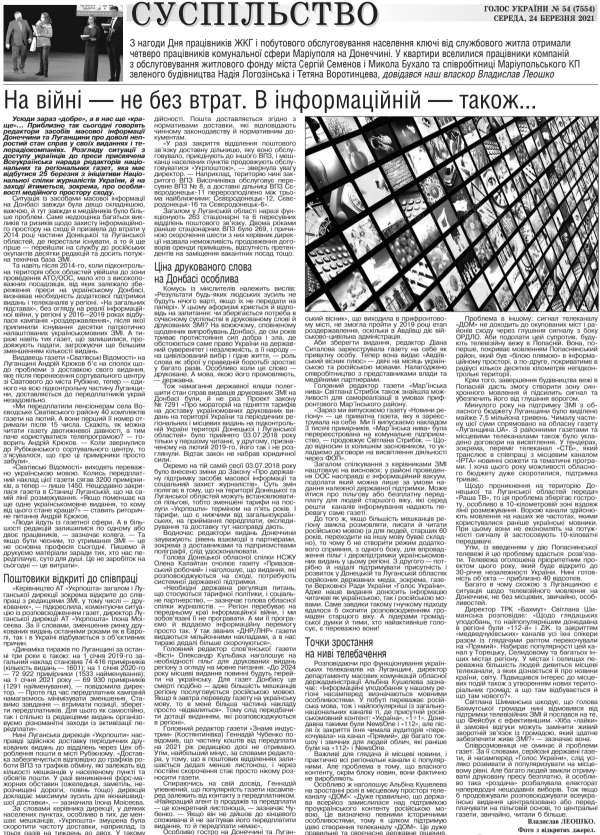Та навіть після 2014 року, коли вся підконтрольна українській владі територія обох областей увійшла до зони проведення АТО/ООС, мало хто із високоповажних посадовців, від яких залежало збереження преси на українському Донбасі, визнавав необхідність додаткової підтримки видань і мовних каналів у регіоні. "На загальних підставах", без огляду на реалії інформаційної війни, у регіоні пройшла у 2016 - 2019 роках кампанія "роздержавлення", після якої припинили існування десятки патріотично налаштованих україномовних ЗМІ, починаючи з обласної газети "Вісті Донбасу", що стовідсотково, на всіх 12-16 шпальтах друкувалася українською, й закінчуючи "Краматорською правдою", що не протрималася у "вільному плаванні" і два роки - закрилась два тижні тому... Пішли в безповоротне минуле й колись найтиражніші "Донбасс", "Донецкие новости" та інші друковані видання. А тиражі навіть тих газет, що залишилися, продовжують падати, загрожуючи ще більшим зменшенням кількості видань.