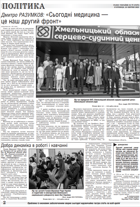 Робоча поїздка Голови Верховної Ради Дмитра Разумкова на Хмельниччину була пов'язана із відкриттям після реконструкції Хмельницького обласного серцево- судинного центру. Разом із главою парламенту на відкритті також побували обрані від Хмельниччини народні депутати, керівники області та міста, а також представники медичної спільноти. (читайте у «Голосі України» на 1-2 стор. >>> article/345199).