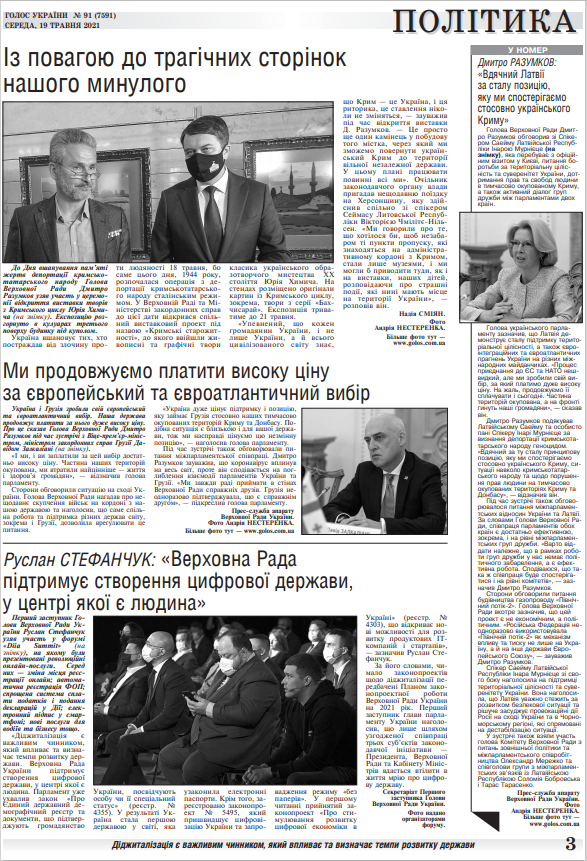 До Дня вшанування пам'яті жертв депортації кримськотатарського народу Голова Верховної Ради Дмитро Разумков узяв участь у церемонії відкриття виставки творів з Кримського циклу Юрія Химича. Експозицію розгорнуто в кулуарах третього поверху будинку під куполом. (читайте у «Голосі України» на 3 стор. >>> article/346110).