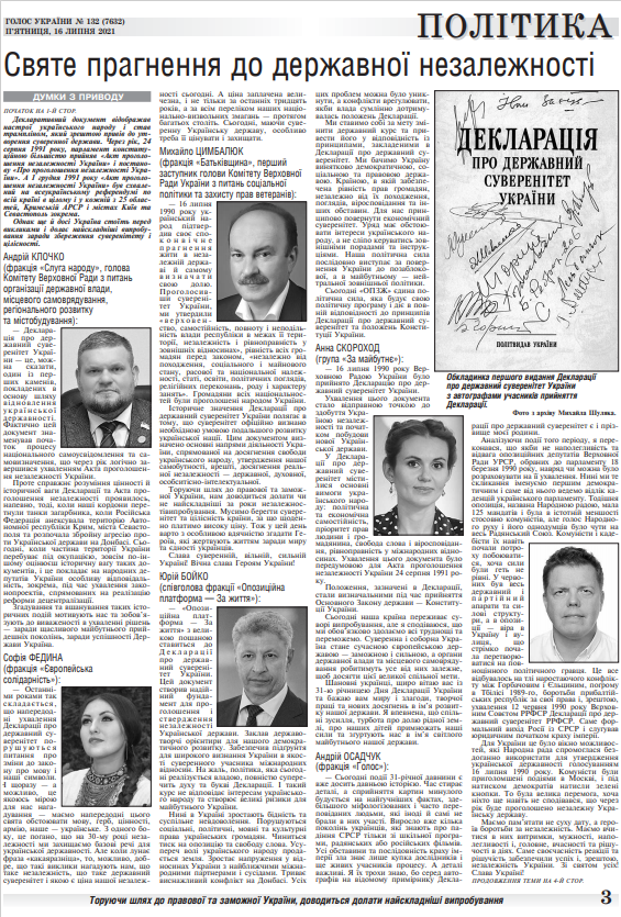 16 липня 1990 року новообраний парламент, який увійшов в історію як Верховна Рада України першого демократичного скликання (1990-1994 роки), ухвалив Декларацію про державний суверенітет. Цим актом українці заявили про своє прагнення до державної незалежності. У преамбулі цього історичного документа зазначено: "Верховна Рада Української РСР, виражаючи волю народу України, прагнучи створити демократичне суспільство, виходячи з потреб всебічного забезпечення прав і свобод людини, шануючи національні права всіх народів, дбаючи про повноцінний політичний, економічний, соціальний і духовний розвиток народу України, визнаючи необхідність побудови правової держави, маючи на меті утвердити суверенітет і самоврядування народу України, ПРОГОЛОШУЄ державний суверенітет України як верховенство, самостійність, повноту і неподільність влади Республіки в межах її території та незалежність і рівноправність у зовнішніх зносинах". (читайте у «Голосі України» на 1, 3-4 стор. >>> article/348598).