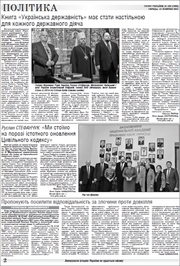 Загальнонаціональна презентація книги «Українська державність: історико-правничі нариси», яка відбулася у Національному заповіднику «Софія Київська», стала науковою платформою для обговорення теми українського державотворення та його понад тисячолітньої традиції, пошуку нових літописних даних про виникнення та становлення Русі-України, популяризації історичних знань про нашу країну. (читайте у «Голосі України» на 2 стор. >>> article/352280).