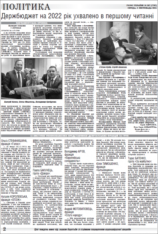 Парламент за результатами розгляду в першому читанні схвалив висновки та пропозиції до проекту закону про Державний бюджет України на 2022 рік. Відповідний проект постанови підтримали 273 народні депутати. (читайте у «Голосі України» на 1-2 стор. >>> article/352985).