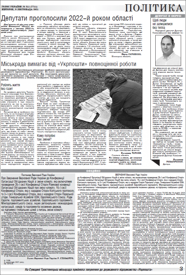 Звернення Верховної Ради України до Конференції Організації Об’єднаних Націй зі зміни клімату, яка включатиме проведення 26-ї сесії Конференції Сторін Рамкової конвенції Організації Об’єднаних Націй про зміну клімату, 16-ї сесії Конференції Сторін, яка є нарадою Сторін Кіотського протоколу, та 3-ї сесії Конференції Сторін, яка є нарадою Сторін Паризької угоди, Генеральної Асамблеї ООН, Європейського Союзу, Ради Європи, парламентських асамблей, Європейського парламенту, Міжпарламентського союзу, інших регіональних і міжнародних організацій, урядів та парламентів іноземних держав, на підтримку глобальних цілей з питань зміни клімату (читайте у «Голосі України» на 3 стор. >>> article/353192).