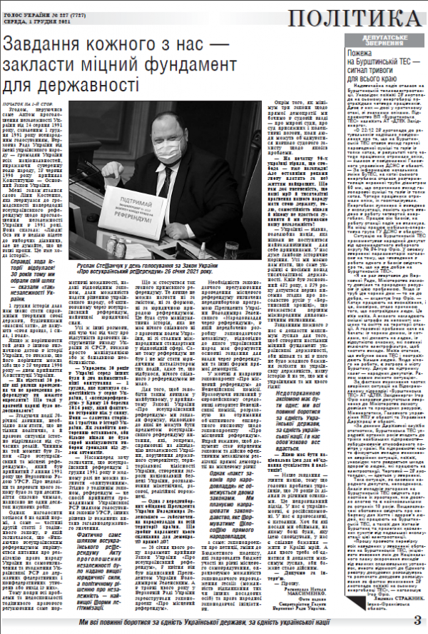 Яке значення мали результати всеукраїнського референдуму 1 грудня 1991 року для Української держави, які кроки робить парламент дев’ятого скликання для посилення демократії прямої дії і як український народ має формувати основні завдання для влади через референдуми. Про це наша розмова з Головою Верховної Ради Русланом СТЕФАНЧУКОМ. (читайте у «Голосі України» на 1, 3 стор. >>> article/353918).