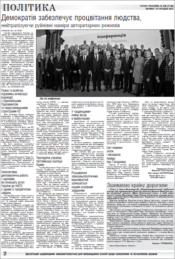Учора Голова Верховної Ради Руслан Стефанчук виступив на Конференції послів України «Дипломатія 30. Стратегія сильної держави» за участі Президента Володимира Зеленського і Прем’єр-міністра Дениса Шмигаля. Людство зіткнулося з викликом демократії, який кинули авторитарні та диктаторські режими у світі, зазначив Голова Верховної Ради України Руслан Стефанчук. (читайте у «Голосі України» на 1-2 стор. >>> article/354668).
