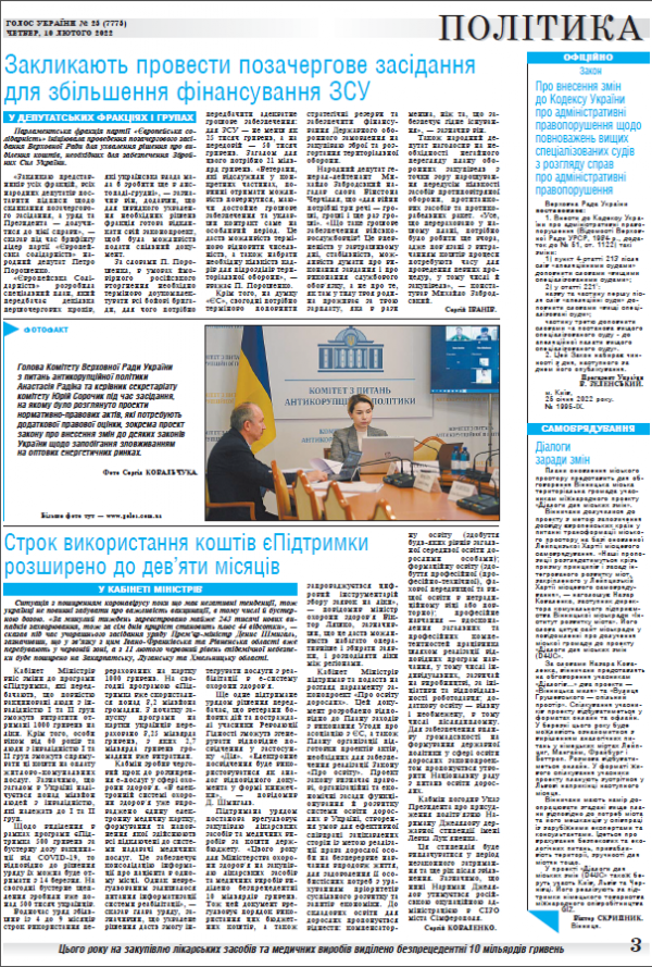 Парламентська фракція партії «Європейська солідарність» ініціювала проведення позачергового засідання Верховної Ради для ухвалення рішення про виділення коштів, необхідних для забезпечення Збройних Сил України. (читайте у «Голосі України» на 3 стор. >>> article/356025).