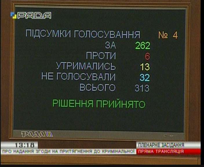 Відповідно до подання Генерального прокурора України, народні депутати 262 голосами надали згоду на притягнення до кримінальної відповідальності народного депутата України С.П.Мельничука.
