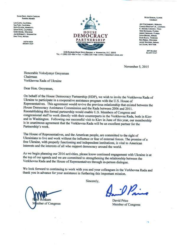 На завершення зустрічі делегація Палати представників Сполучених Штатів Америки передала листа Голові Верховної Ради України щодо відновлення угоди про партнерство між Комісією ПРДП та нашим парламентом, яка дозволить членам і співробітникам Конгресу співпрацювати безпосередньо зі своїми колегами у парламентах України та Сполучених Штатів Америки.