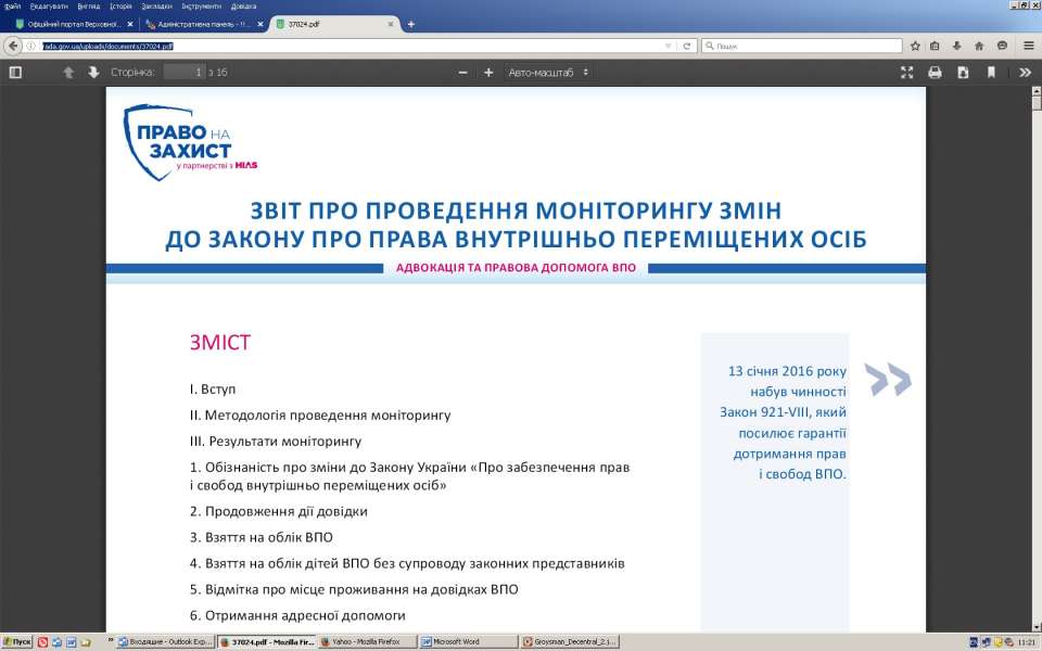 Крім того, на засіданні Комітету експерт Всеукраїнського благодійного фонду "Право на захист" Олена Виноградова презентувала звіт про проведення моніторингу стану виконання Закону України «Про внесення змін до деяких законів України щодо посилення гарантії дотримання прав і свобод внутрішньо переміщених осіб» № 921-VIII від 24 грудня 2015 року в Донецькій, Луганській, Запорізькій, Дніпропетровській та Харківській областях.