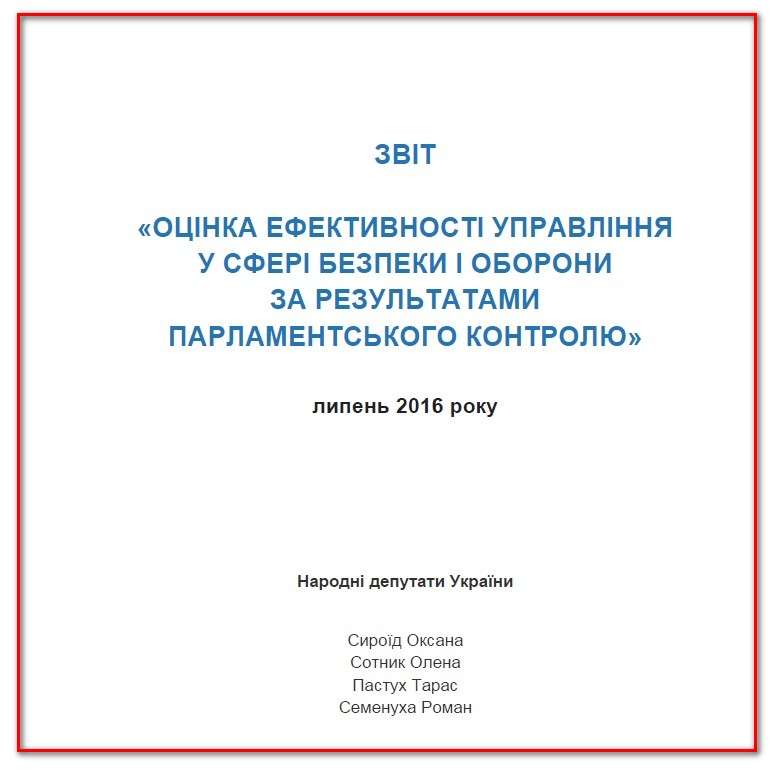 В Україні сектор безпеки й оборони вважається сферою «недоторканою» та лише для «обраних». «Державна таємниця» приховує як корупційні схеми, так і неспроможність ефективно керувати збройними силами. Попри те, що парламентський контроль не може бути ефективним у сфері, де будь що є державною таємницею, це не звільняє парламент від обов’язку здійснювати такий контроль. Запропонований звіт – частина виконання такого обов’язку перед людьми.