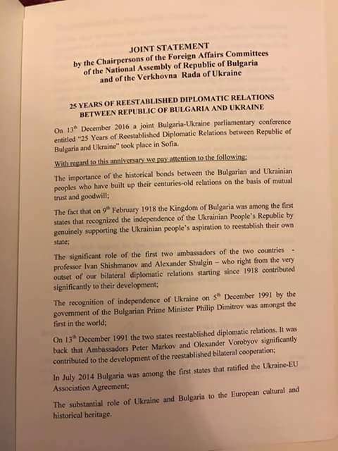 На завершення парламентської конференції була підписана спільна заява Голів Комітетів у закордонних справах Верховної Ради України та Народних Зборів Республіки Болгарія, як знак взаємної підтримки і солідарності двох парламентів та готовності до нарощування позитивної динаміки взаємної співпраці.