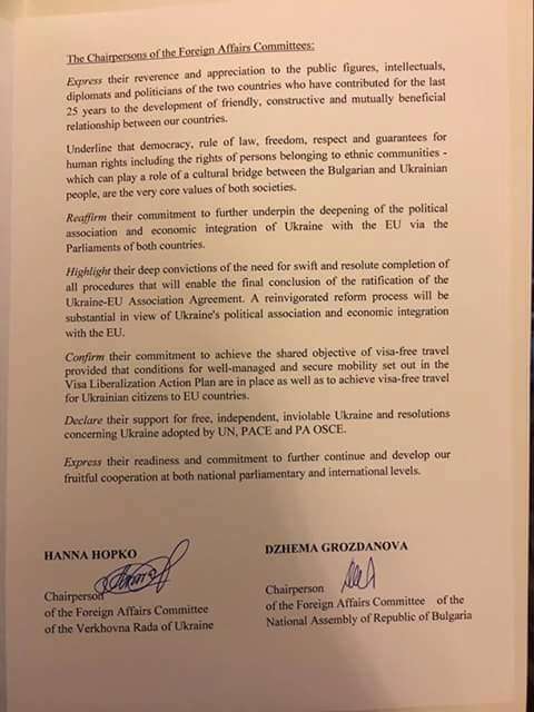 Голова Комітету у закордонних справах Ганна Гопко відзначила Республіку Болгарію як одного з найважливіших партнерів України у регіоні Південно-Східної Європи і висловила сподівання на подальшу активізацію міжпарламентського співробітництва та пожвавлення політичного діалогу на найвищому і високому рівнях. В ході свого виступу Ганна Гопко висловила вдячність за послідовну підтримку Болгарією суверенітету і територіальної цілісності нашої держави, яка має надзвичайне значення для українського народу, котрий бореться з агресією з боку Росії.
