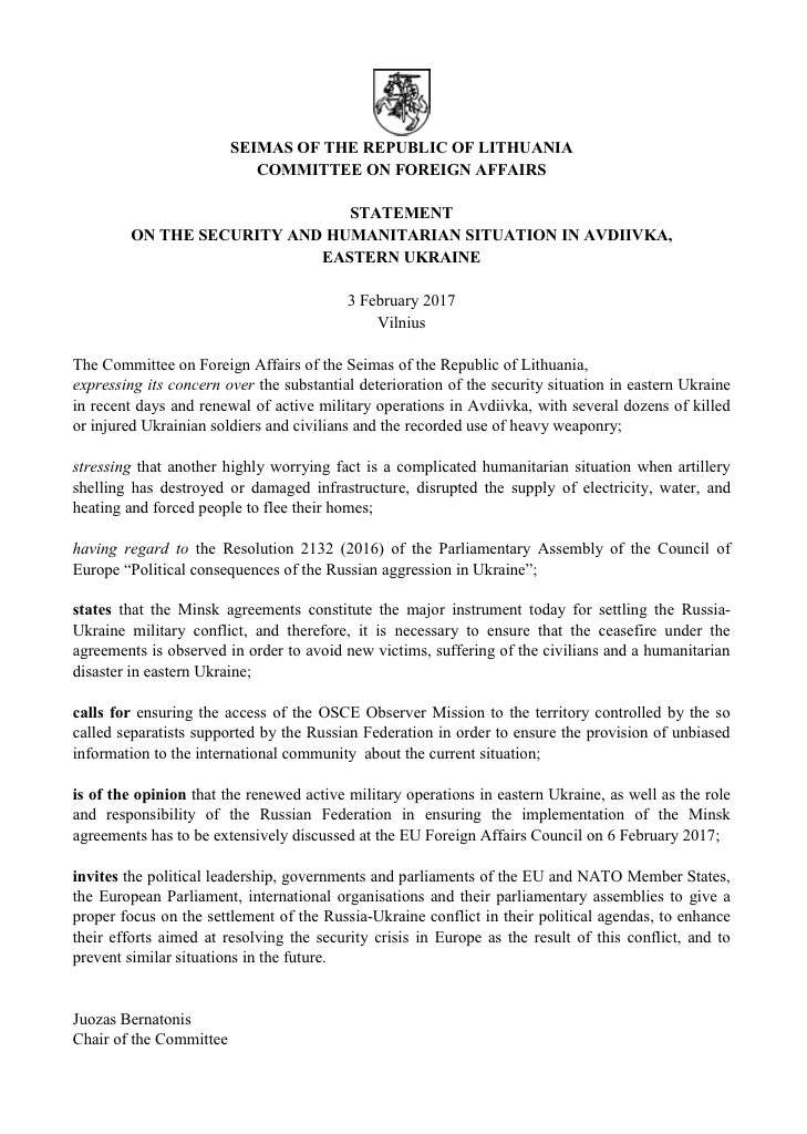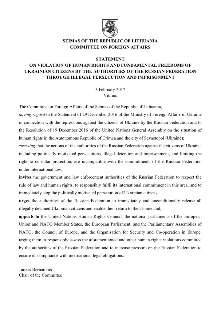 У зв’язку із цими заявами Комітет Верховної Ради України у закордонних справах висловлює щиру подяку литовським колегам за підтримку, яку вони постійно надають Україні у її боротьбі із російською агресією, а також висловлює сподівання, що заклики литовських парламентаріїв будуть почуті світовим співтовариством.