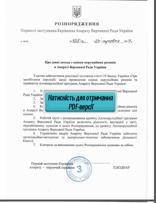 З метою забезпечення реалізації положень статті 19 Закону України «Про запобігання корупції» щодо проведення оцінки корупційних ризиків та прийняття Антикорупційної програми Апарату Верховної Ради України: