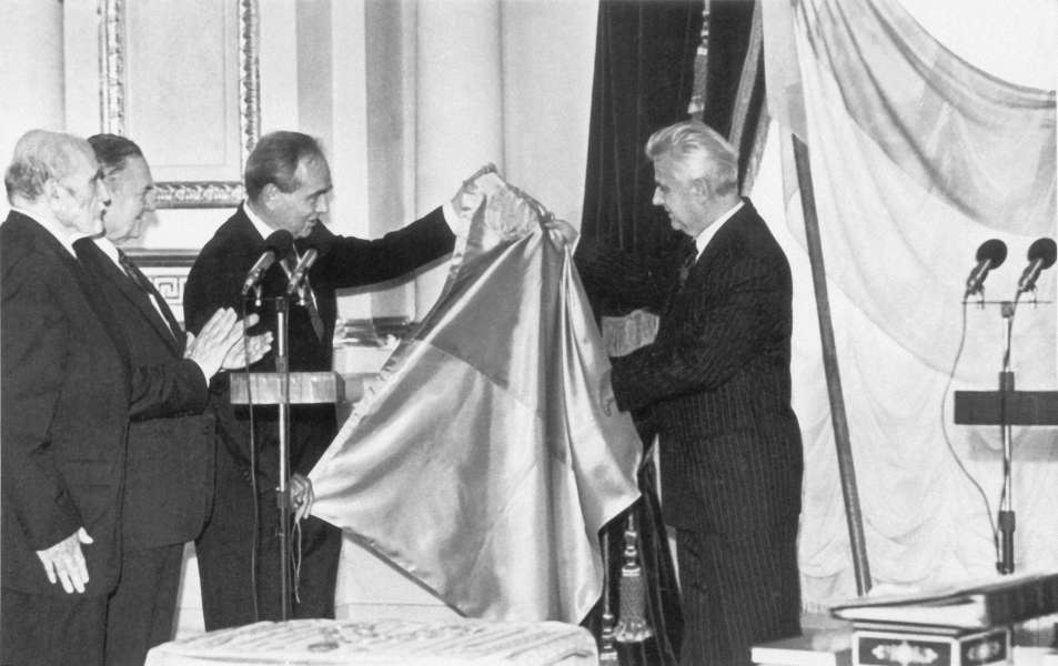 Процес державотворчої спадкоємності від Української Народної Республіки до незалежної України було завершено символічною передачею владних повноважень останнім президентом УНР в екзилі першому Президентові незалежної України 22 серпня 1992 року. Цього дня на урочистому засіданні Верховної Ради України в палаці «Україна» урочисто проголошено про завершення діяльності Державного Центру УНР в еміграції. Наступного дня у Маріїнському палаці делегація ДЦ УНР урочисто передала символи влади ДЦ УНР українській владі - Прапор, Печатку та Президентський Клейнод.