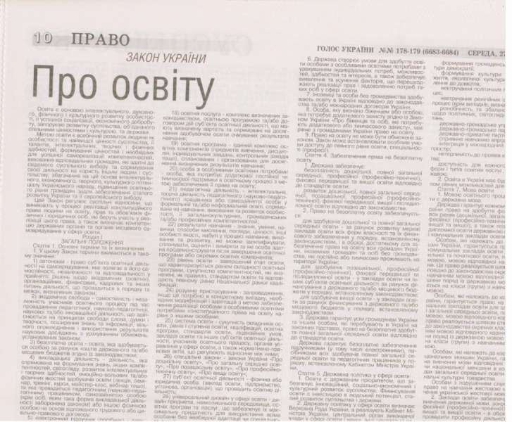 Сьогодні, 27 вересня, у газеті Верховної Ради «Голос України» опубліковано Закон України «Про освіту».