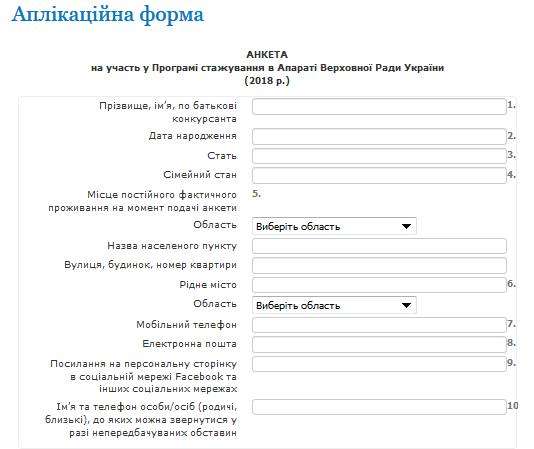 Анкета містить гіперпосилання, за яким ви зможете знайти вимоги до інтернів для стажування у конкретному структурному підрозділі Апарату Верховної Ради України, а також орієнтовний перелік завдань під час стажування для ознайомлення з їх умовами тут).
