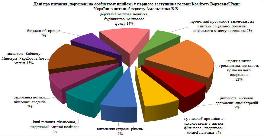 У своїх зверненнях до народного депутата України відвідувачі порушували питання фінансової, податкової, митної політики, діяльності Верховної Ради України, Президента України та Кабінету Міністрів України, житлової та соціальної політики тощо.