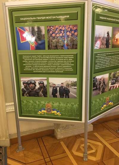 Зокрема, експозиція розповідає про те, що Нацгвардія як військове формування з правоохоронними функціями входить до системи Міністерства внутрішніх справ України і призначене для виконання завдань із захисту та охорони життя, прав, свобод і законних інтересів громадян, суспільства і держави від злочинних та інших протиправних посягань, охорони громадського порядку та забезпечення громадської безпеки, а також у взаємодії із правоохоронними органами – із забезпечення державної безпеки і захисту державного кордону, припинення терористичної діяльності, діяльності незаконних воєнізованих або збройних формувань (груп), терористичних організацій, організованих груп та злочинних організацій.