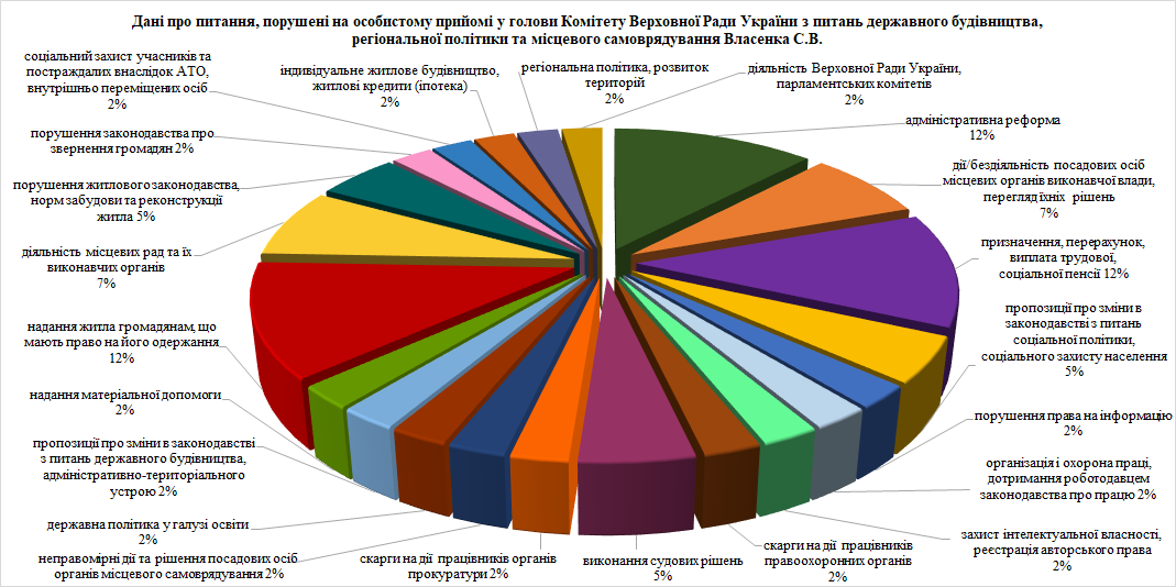 Під час особистого прийому відвідувачі порушили 41 питання. Серед них переважали питання державного будівництва, адміністративно-територіального устрою, діяльності органів місцевого самоврядування та місцевих органів виконавчої влади, соціальної і житлової політики.