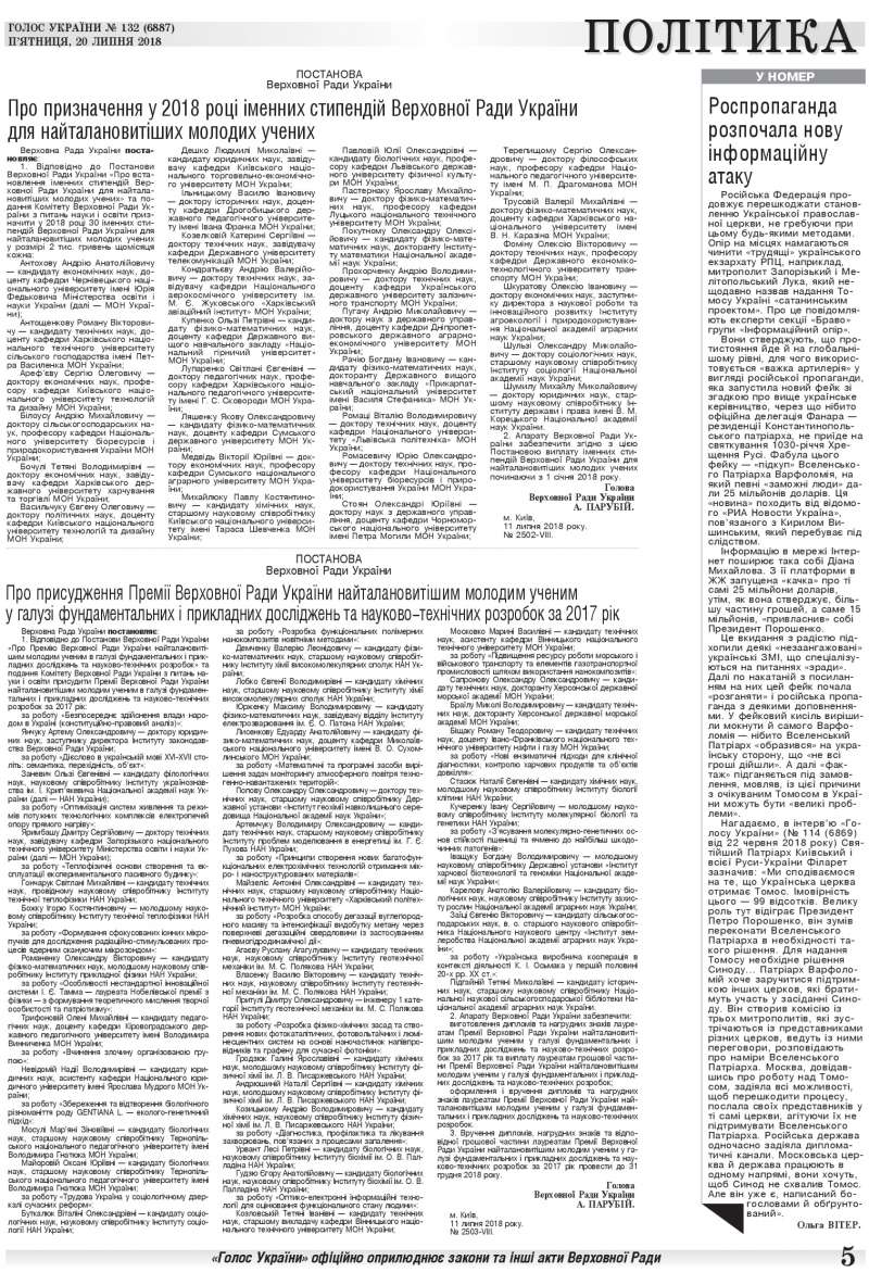Постанова Верховної Ради України про присудження Премії Верховної Ради України найталановитішим молодим ученим у галузі фундаментальних і прикладних досліджень та науково-технічних розробок за 2017 рік (читайте у «Голосі України» на 5 стр. >>> article/305403)Повний випуск «Голосу України» від 20.07.2018 на сайті http://www.golos.com.ua