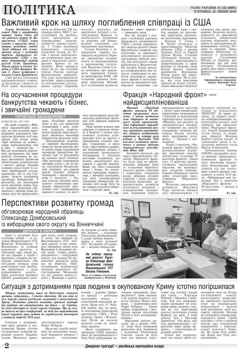 Обшуки, залякування, тиск на бізнесменів, свавільні арешти, катування... І навіть вбивства. Це аж ніяк не весь перелік сваволі російських окупантів в анексованому Криму. Особливих утисків зазнають кримські татари та українці, які стверджують, що Крим — це Україна, без якої півострів не може окремо існувати. Про це вчора йшлося на прес-конференції, на якій був оприлюднений аналіз порушень прав людини на українському півострові у першому півріччі 2018 року. (читайте у «Голосі України» на 2 стр. >>> article/305422)