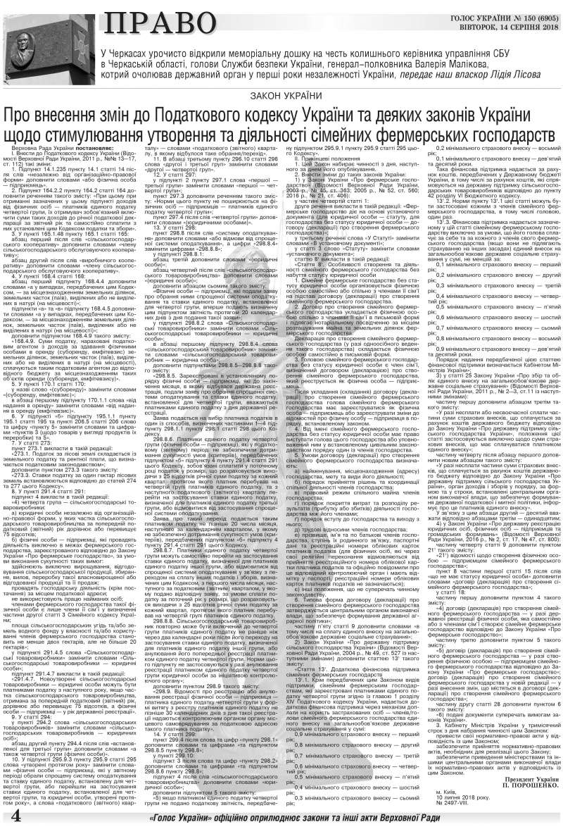 У «Голосі України» опубліковано Закон про внесення змін до Податкового кодексу України та деяких законів України щодо стимулювання утворення та діяльності сімейних фермерських господарств. (читайте у «Голосі України» на 4 стр. >>> article/306325)