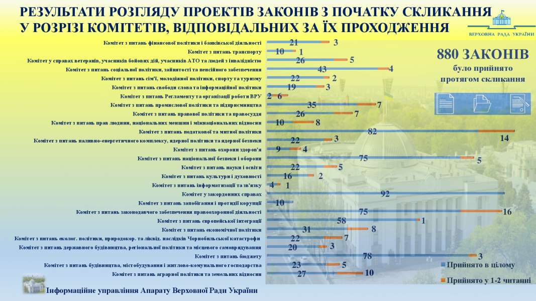 Всього за час роботи Верховної Ради VIII скликання було прийнято 880 законів в цілому, зокрема 88 законів – протягом восьмої сесії.