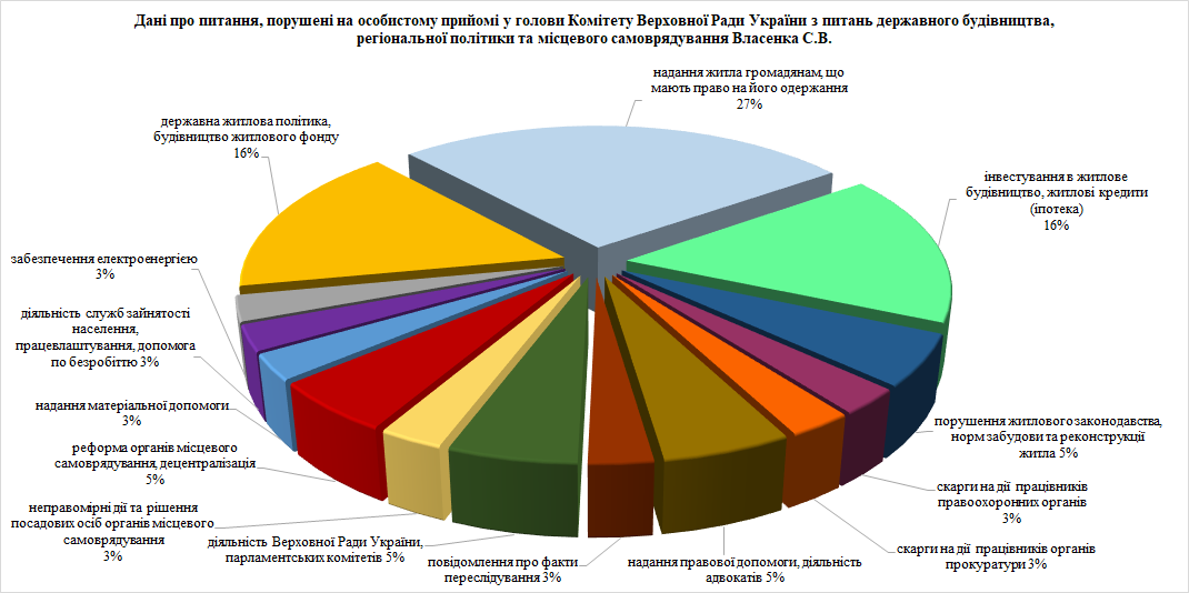Під час особистого прийому відвідувачі порушили 37 питань. Серед них переважали питання житлової політики, забезпечення дотримання законності та охорони правопорядку, реалізації прав і свобод громадян, запобігання дискримінації, діяльності органів місцевого самоврядування, діяльності Верховної Ради України, Президента України та Кабінету Міністрів України, соціальної політики, соціального захисту населення, комунального господарства, праці і заробітної плати.