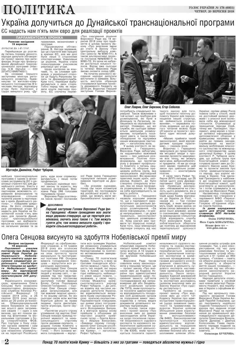 Вечірнє засідання 18 вересня Парламент ухвалив постанову про Заяву Верховної Ради України до Норвезького Нобелівського комітету щодо висунення кандидатури українського політв’язня Олега Сенцова на здобуття Нобелівської премії миру. За відповідний проект постанови № 9040 проголосували 245 депутатів. Українського кінорежисера, кримчанина Олега Сенцова було незаконно заарештовано федеральною службою безпеки Російської Федерації 10 травня 2014 року, а 25 серпня 2015 року засуджено до 20 років ув’язнення. Обвинувачувальний вирок базувався на показах всього двох затриманих свідків — і один з них визнав, що всі покази давав під фізичними та моральними тортурами з боку співробітників ФСБ. Про тортури з боку слідчих органів заявляв і сам Олег Сенцов. Наразі Сенцов незаконно утримується на території Російської Федерації за сфабрикованою справою, а 14 травня 2018 року він оголосив безстрокове голодування на знак протесту проти аморальної та протиправної політики РФ. Основна вимога голодування Сенцова — відпустити всіх українських заручників. (читайте у «Голосі України» на 2 стр. >>> article/307738)