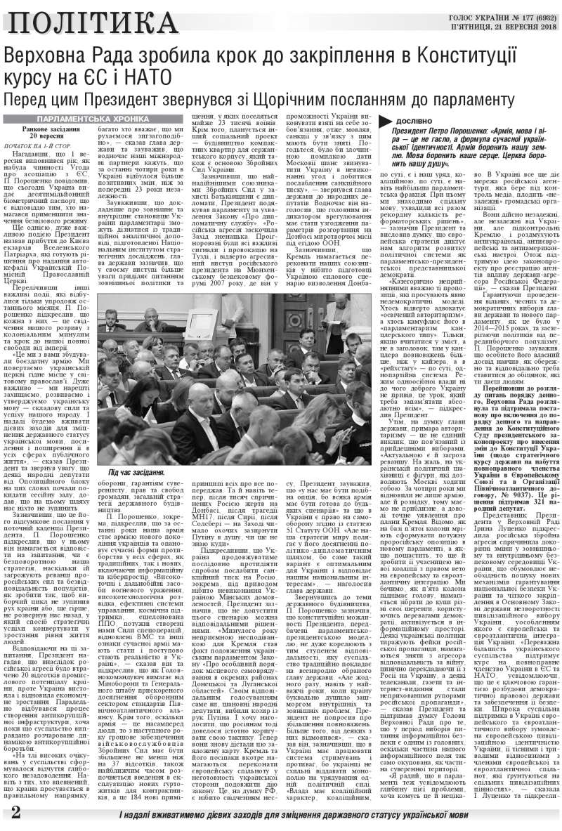 Перейшовши до розгляду питань порядку денного, Верховна Рада розглянула та підтримала постанову про включення до порядку денного та направлення до Конституційного Суду президентського законопроекту про внесення змін до Конституції України (щодо стратегічного курсу держави на набуття повноправного членства України в Європейському 21.09.2018 Верховна Рада зробила крок до закріплення в Конституції курсу на ЄС і НАТО Перед цим Президент звернувся зі Щорічним… http://www.golos.com.ua/article/307804 7/10 Союзі та в Організації Північноатлантичного договору, № 9037). Це рішення підтримав 321 народний депутат. (читайте у «Голосі України» на 2 стр. >>> article/307804)
